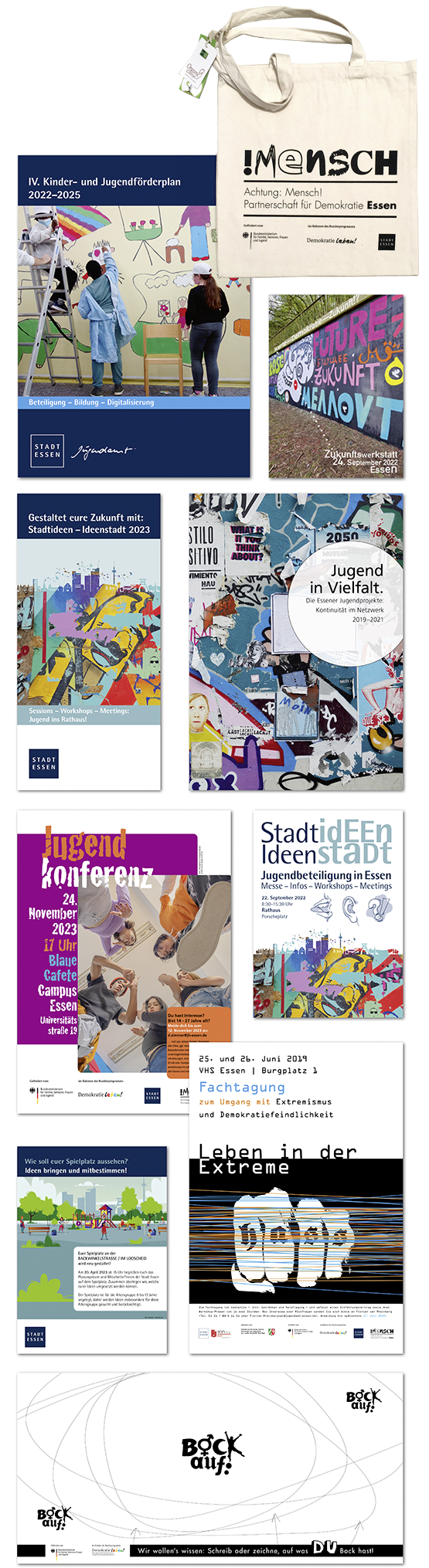 Im Auftrag des Jugendamts der Stadt Essen und der Jugendhilfe Essen habe ich Logos, vielfältige Kommunikationsmittel und Arbeitsmaterialien entwickelt – thematische Schwerpunkte sind Beteiligung und Demokratiebildung, Integration und Prävention gruppenbezogener Menschenfeindlichkeit.