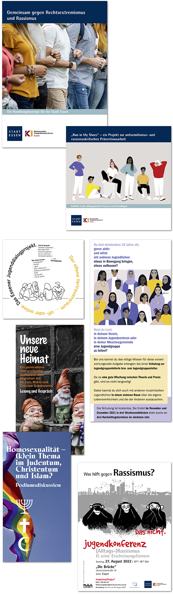 In den folgenden Jahren konnte ich etliche weitere Flyer und Plakate für das KI (teils in Kooperation mit dem RAA Verein) gestalten, z.B. Programme zu den Internationalen Wochen gegen Rassismus, zu Konferenzen und Podiumsdiskussionen, Lesungen und verschiedenen Dialogformaten.