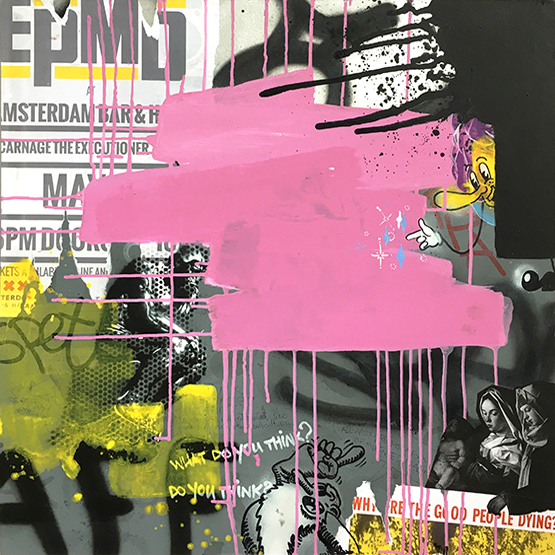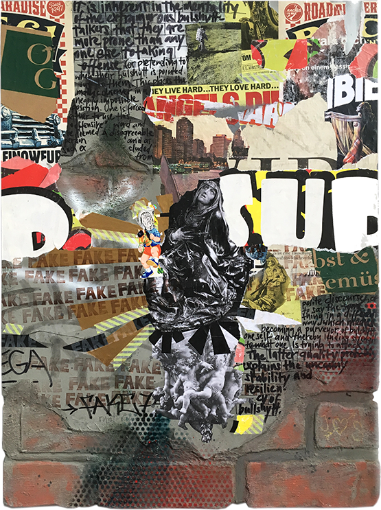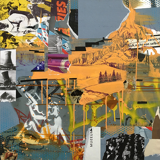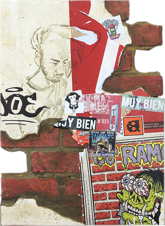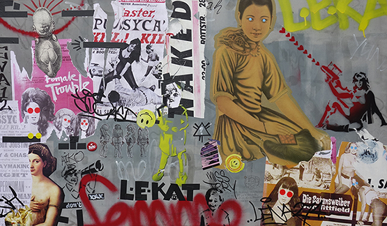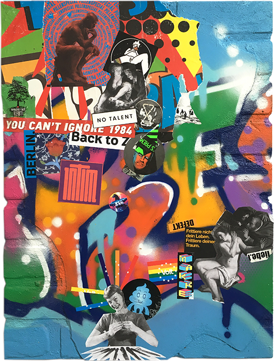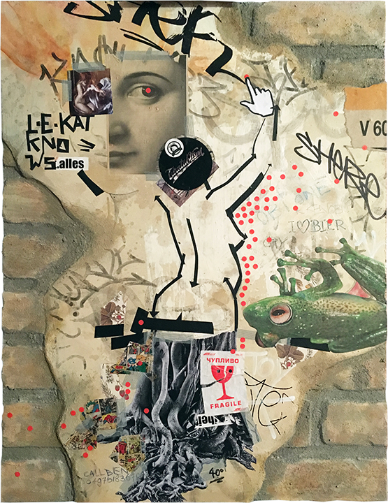 Graffiti trifft auf Collage, Malerei wuchert über Zeitungsseiten, Portraitzeichnung ergänzt Sticker-Cluster. Gedachtes, Erlebtes und (buchstäblich) Erlesenes verbindet sich mit (vermeintlich) Zufälligem und vielfach Veröffentlichtem, Politisches mit Privatem – es führt ein Schnipsel, ein Wort, ein Klecks zum nächsten: miteinander kommunizierende Teilchen.